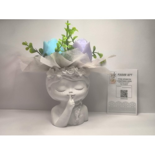 Изискана декоративна композиция от нежни цветя, подредени като стилен букет в ръчно изработена гипсокерамична кашпа „Момиче“. Дизайнът носи усещане за женственост, финес и артистична елегантност, превръщайки изделието в изразителен интериорен акцент.