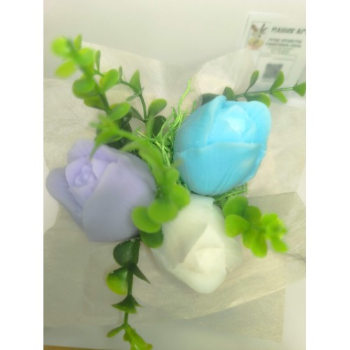 Цветята са изработени от ароматен глицеринов сапун с етерични масла. Деликатният аромат създава усещане за уют и спокойствие, а композицията остава като красив и вечен спомен.